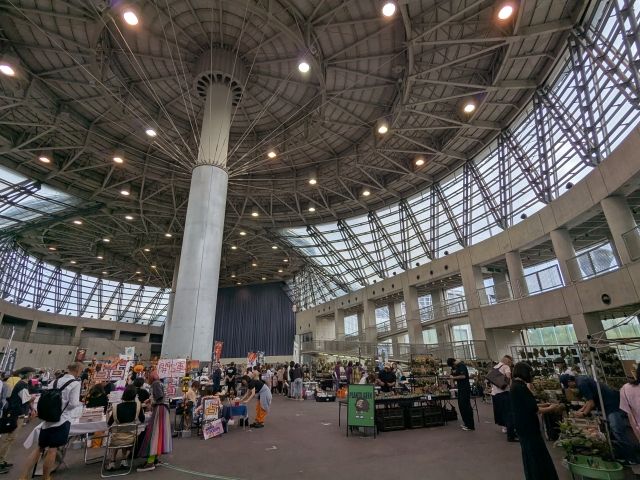 閉幕後も水の館ホールとして利用されてきましたが、花博20周年を記念して公募によりハナミズキホールに改名。内部は広々とした空間となっており、フリーマーケットなどのイベントが開催されています。訪問時はメダカや観葉植物が販売されていました。