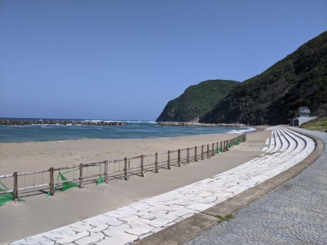 境内のすぐ隣には、小茂田浜海水浴場。はるか昔ここで激しい戦いが行われたことなんて全く感じさせない穏やかなビーチ。さざ波が立つ美しい海水浴場です。