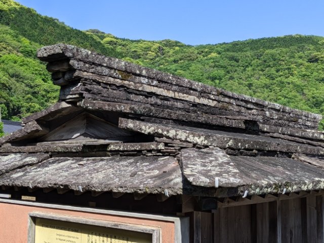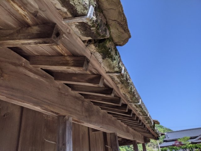 屋根以外の部分は松などの木材を使用しています。斜めに積まれた石屋根は滑り落ちないかと不安になります。現在は金具による補強がされていますが、当時は何かで留めていたのでしょうか。