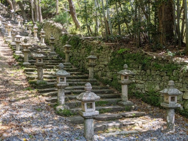 境内には百雁木(ひゃくがんぎ)という場所があります。雁木というのは階段のことで、遥か上部へと続く石の階段とずらりと並んだ灯籠が圧巻です。