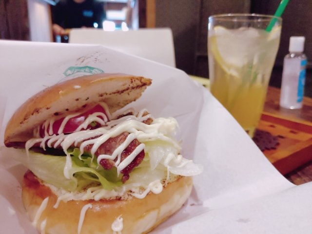 看板メニューはひじき入りパティとイカが入った「対馬バーガー」、そして対馬名物のとんちゃんを挟んだ「とんちゃんバーガー」。今回はとんちゃんバーガーにしてみました。