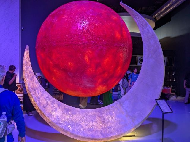 内部は広い空間。その中央に置かれているのは、大きな月と太陽のオブジェ。太陽はゆっくりと回転しています。