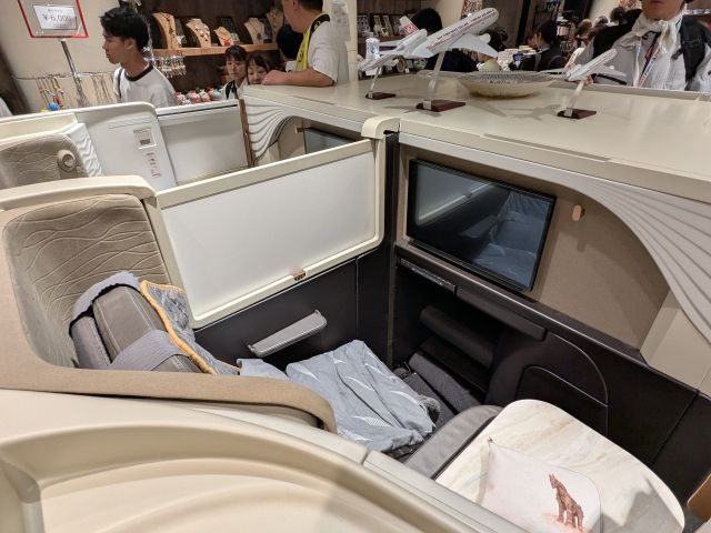 ショップ内にはターキッシュエアラインズのビジネスクラスシートも。脚を伸ばせるラグジュアリーな座席、実際に座ってその快適さを体験することができます。