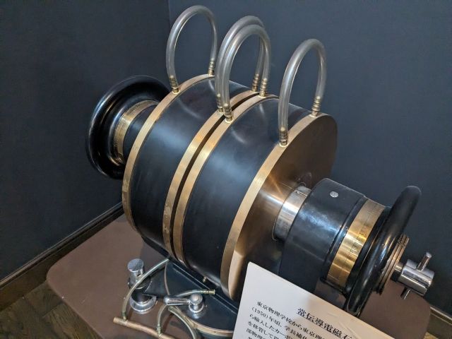 この常伝導電磁石は、昭和25年ごろ戦時中ドイツから輸入した高純度鉄によって 作られた電磁石の一号機。高性能で強磁場が得られ、核磁気 共鳴の研究成果が昭和28年の理論物理国際会議で発表され、その後も電子物性測定を通して多くの修士・博士 研究の一端を担ったそうです。