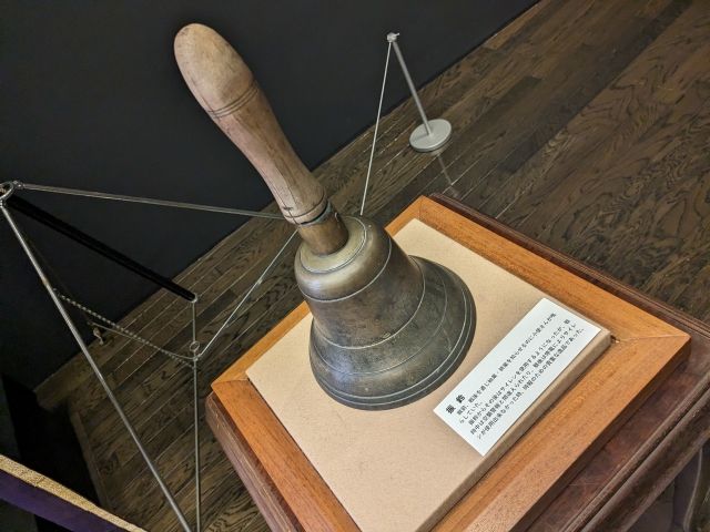 始業、終業を知らせるために鳴らせていた振鈴。これとは別にサイレンも使用されていましたが、戦時中は空襲警報と間違われたり、戦後は停電などで利用できなかったりしたため、この鈴が重宝したそう。鳴らしてみると、けっこう大きな音がします。