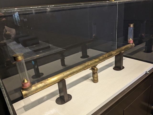 奎運ホールでは大学にちなんだモノが展示されています。こちらの水準器は、開校当初より保存されていたもの。明治初頭につくられた貴重な国産の科学実験器です。