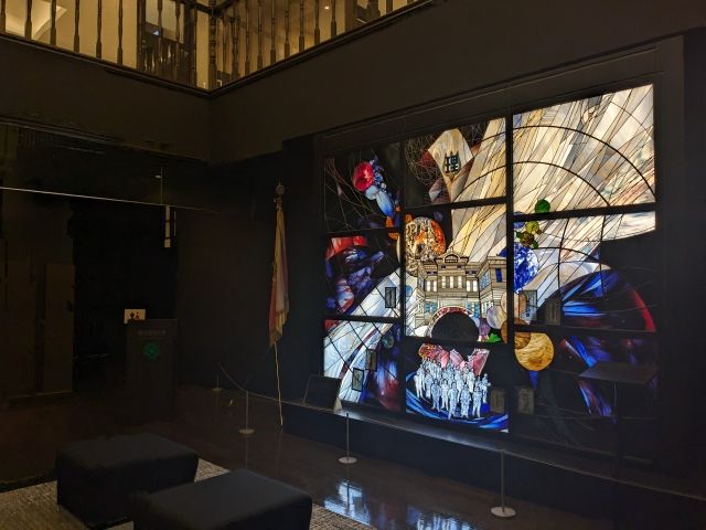 奥に広がる「奎運(けいうん)ホール」は、吹き抜けの空間。鮮やかなステンドグラスは、建学の精神「理学の普及を以て国運発展の基礎とする」を象徴しているそうです。