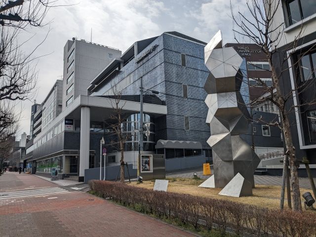 外堀通りにある不思議なモニュメントは坊っちゃんの塔。夏目漱石の小説『坊っちゃん』の主人公が東京理科大学の前身である東京物理学校卒業生であることに由来しているそうです。「鏡映対称な一対の五面体ペンタドロンを組み合わせている」とのことですが、なかなか難しいです。