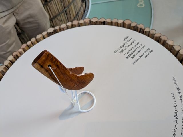 ナツメヤシの森の中には、様々なものが展示されています。こちらのフェッタムは、真珠採取のダイバーが利用する鼻クリップ。海のイメージがあまりなかったのですが、周囲の大半がペルシャ湾に面しています。かつては真珠採集は重要な産業であったそうです。
