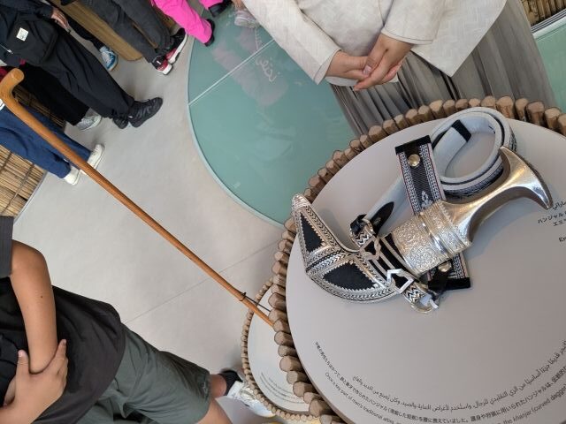 エミラティの短剣、ハンジャル。護身や狩猟に使用される伝統的な装いのひとつ。渋い輝きを見せるシルバーの装飾がとってもかっこいいです!ちなみに「エミラティ」というのは「UAEの国民」のことを指す言葉です。”Emirati”=首長国なので、日本語にすると「首長国人」。聞きなれない言葉でしたが、”Japanese”や”Chinese”と同じ感覚ですね。