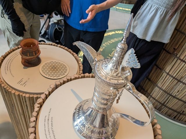 こちらはダッラと呼ばれる伝統的なコーヒーポット。これで淹れたガフワ(アラビアコーヒー)を振る舞うことが、客人のもてなしの象徴であるそう。