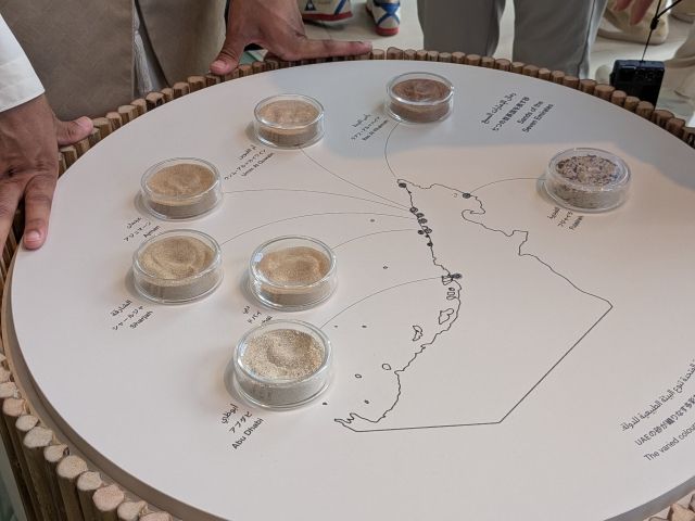 シャーレに入っているのは各首長国の砂。UAEは7つの首長国からなる国。海に近いと白く、山は茶色くなるといったように砂にも違いがあります。