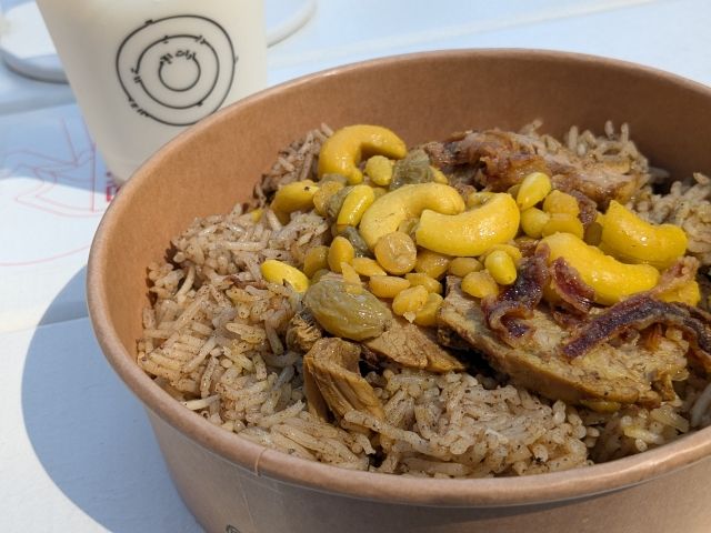 今回注文したのはラム・ウージ。伝統的なエミラティスパイスライスとラム肉のグリル。黄色豆とナッツ、フライドオニオンが彩ります。辛さはまったくなく、独特な酸味を感じるテイストです。