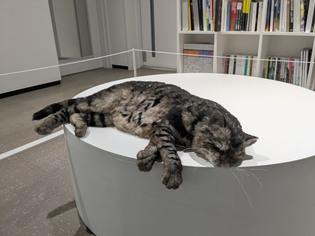 エントランスで来館者を出迎えるのは、ごろんと寝転がるネコ。一瞬、生きたホンモノのネコかと思うほどリアルな作品はライアン・ガンダーの《Sowing confusion amongst the titles, or The squatters》。よく見ると、呼吸するかのように少しずつ動いています。