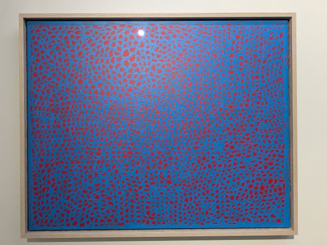 この色彩と模様は草間彌生だ!カボチャのようなモチーフが描かれていない抽象的な絵画は、《今こそわが芸術のおとづれをまっているワタシ ハナバナしいわが心のナメグサのおとづれをまっている いつ年月をえてしらぬまにわたしは 今日のわたしはさみしかったので空の白いクモみつめたのだ》という、非常に長い名前の作品なのです。