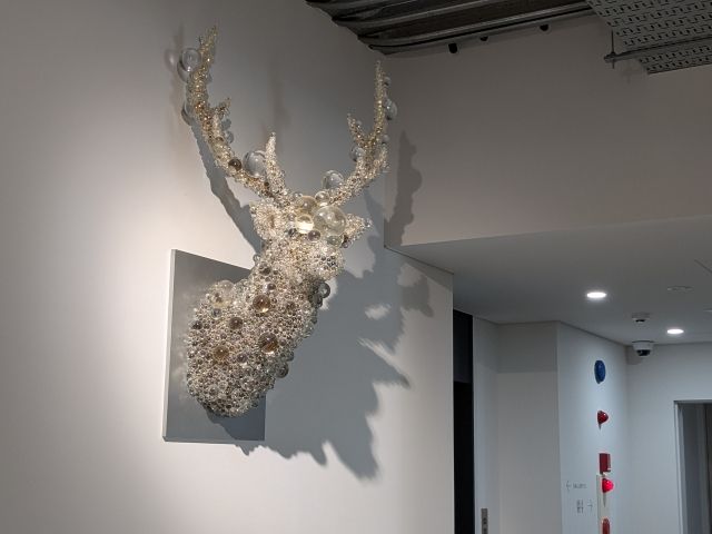 壁から生えるシカの頭は名和晃平《PixCell -Deer #40》。泡のように集まるビーズによって形作られている作品です。