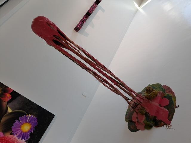 赤い頭部から液体が垂れ下がるショッキングな作品はマーク・クイン《Thick Pink Nervous Breakdown》。未知の生物のようでも、人間の成れの果てのようでもあります。