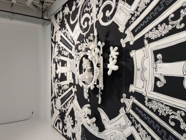 壁一面に広がるモノトーンの作品、ニコラ・ビュフ《ポーリア (カルトゥーシュ)》。中央部分だけ立体感があり、初期ディズニーのようなポップでワンダーな世界がキャンバスから飛び出します。