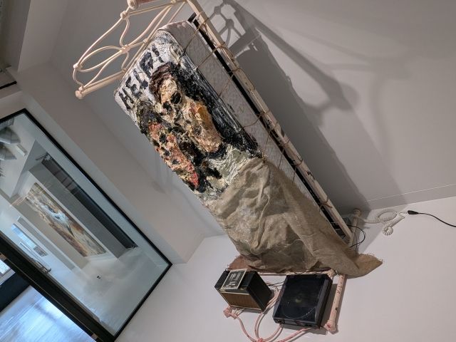 垂直に置かれたベッドに横たわる2人の人物。足元にはVOXアンプとレコードプレイヤー、そしてPLASTIC ONO BANDのレコード。水戸部七絵《remember love》という作品で、ジョン・レノンとオノ・ヨーコの「Bed-ins for Peace」というパフォーマンスをテーマにしています。