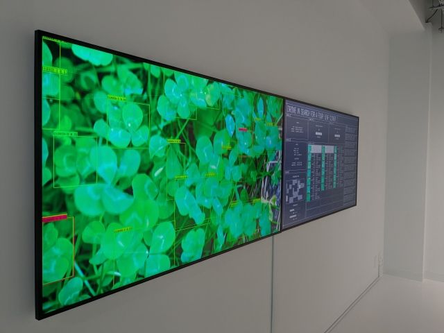 壁に張られたディスプレイに映し出されるのは、クローバーの群生地とそれを分析する映像。スプツニ子!《幸せの四葉のクローバーを探すドローン》という作品で、その名の通り四葉のクローバーを見つけると赤い枠が現れます。テクノロジーによって超高速で幸せを見つけ出すという、科学の進歩に対する皮肉も感じる作品です。