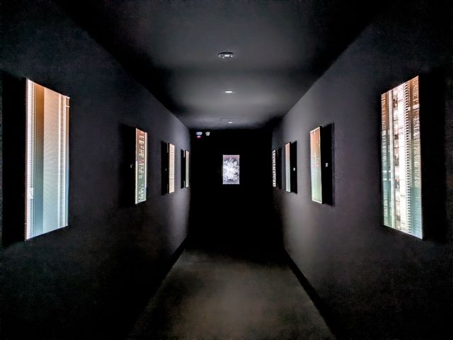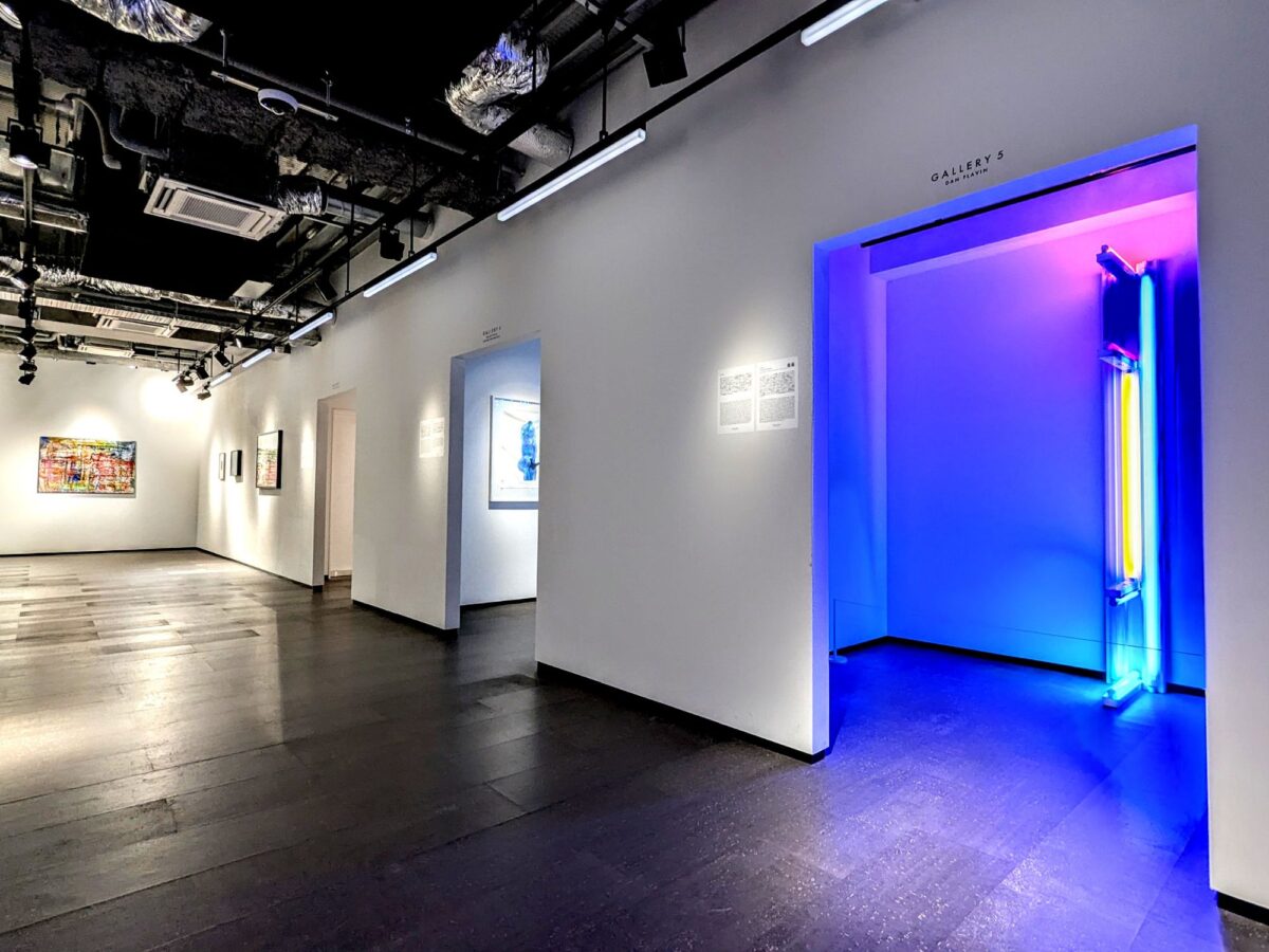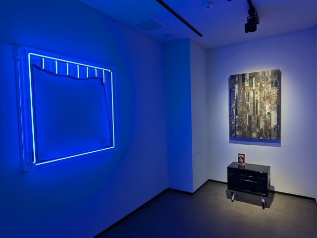 大きな美術館ではありませんが、小さなインスタレーションの部屋も多数備えています。シアスター・ゲーツの部屋では、ブルーのネオン、ペイントされた木のボード、真っ黒に塗られた棚が並ぶ。スピーカーからはピアノやフルートによるアヴァンギャルドなBGMが流れています。