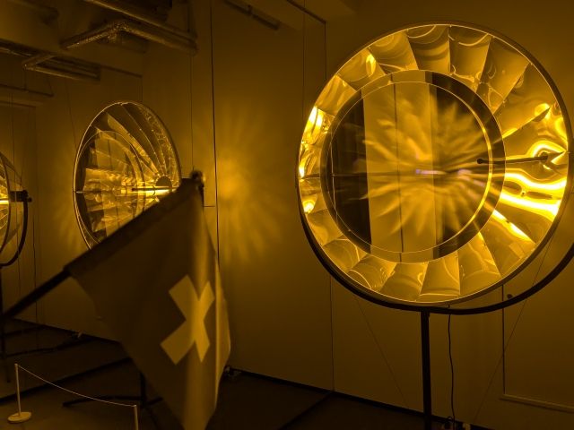 大きな単一周波数ライトが置かれたオラファー・エリアソンの部屋。この部屋の中では、すべてが黄色く染まり、色が識別できなくなります。部屋の入り口にカラフルな旗が置かれているため、モノトーンコーデで来てしまっても、色が消える瞬間を体感できます。