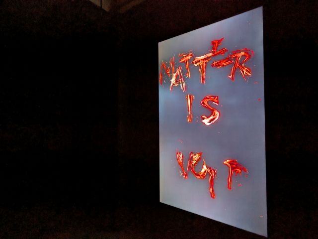 大きなスクリーンが置かれた小さな暗い部屋。ここは、チームラボの部屋。ディスプレイでは、真っ赤な文字「Matter hs Void」が流れては消えていく。チームラボ=大きくて派手なイメージでしたが、ここでは静かに落ち着いた作風を見せてくれます。
