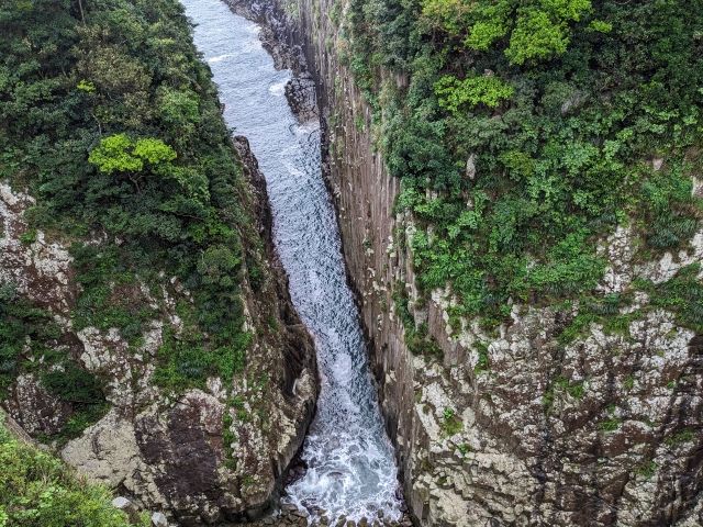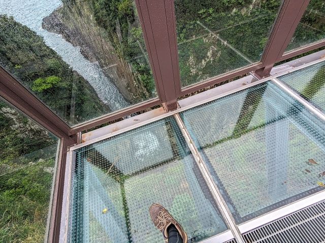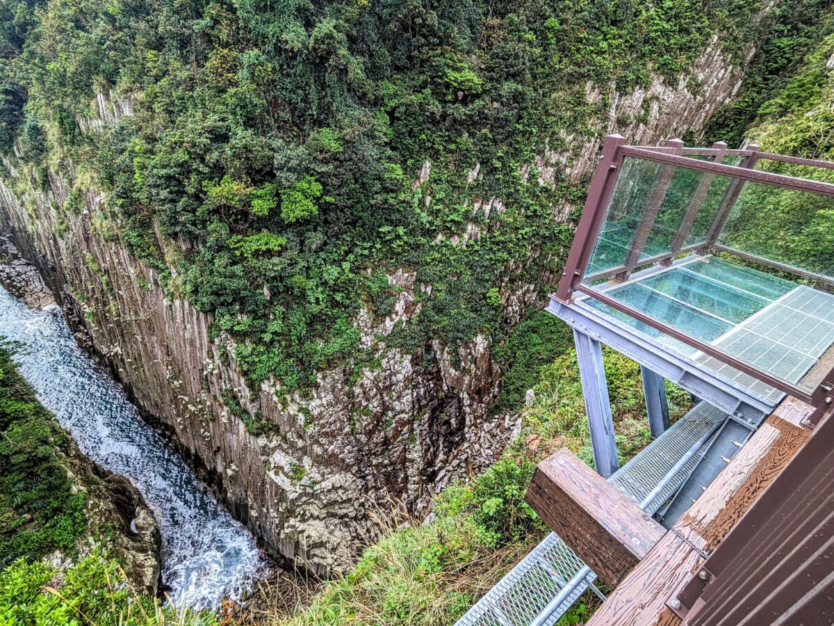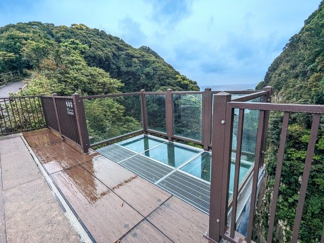 日向岬のダイナミックな地形を存分に体感できるのが馬ヶ背と呼ばれるスポット。深く切り立った断崖を見下ろすスリルを体感できます。2022年には、まさかのガラス張り展望台が開設されました。