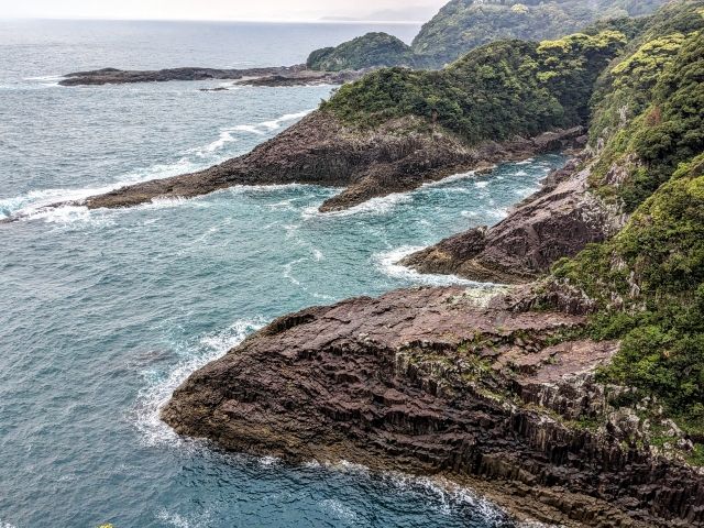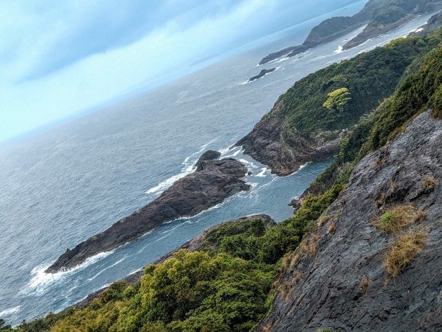 ここは周辺を見渡す展望スポットでもあります。写真中央の崖は、さきほどの日向岬展望所。離れてみた方が、スリルを感じるのは私だけでしょうか。