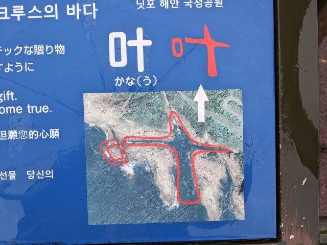 クルスというのは一目瞭然ですが、願いが叶うとはどういうことなのでしょうか。その秘密がコチラ、十字架のそばに浮かぶ小島を合わせてみることで、「叶」という漢字に見えるのです。