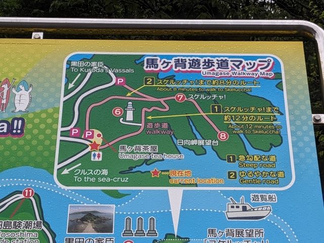 駐車場からは遊歩道が延びており、①スケルッチャまでは徒歩8分ほどの道のり、その先の②日向岬展望台はそこから3分ほど。帰りに③細島灯台に寄り道した場合、歩行時間はトータルで30分ほどです。