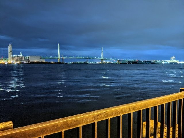 海芝公園の目の前には、暗い海に浮かぶ鶴見つばさ橋。橋長約1kmの斜張橋で、首都高速湾岸線が通り抜けています。また、鶴見つばさ橋の右奥には、うねる横浜ベイブリッジもうっすらと見えます。