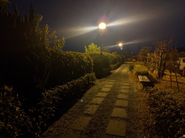 ここは海芝公園。この海を望む素敵な景観を多くの人に解放するために、1997年に設置されました。辺りは真っ暗ですが、公園内は街灯が灯っているためなかなか良い雰囲気。