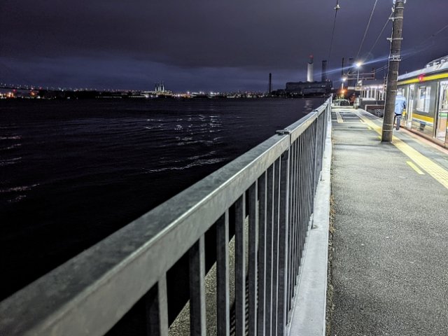 この海芝浦駅、ホームの隣は海という超臨海駅なのです。日が暮れてからの訪問であったため、少々ダークですが、潮の香りと海の音が何とも心地良い。