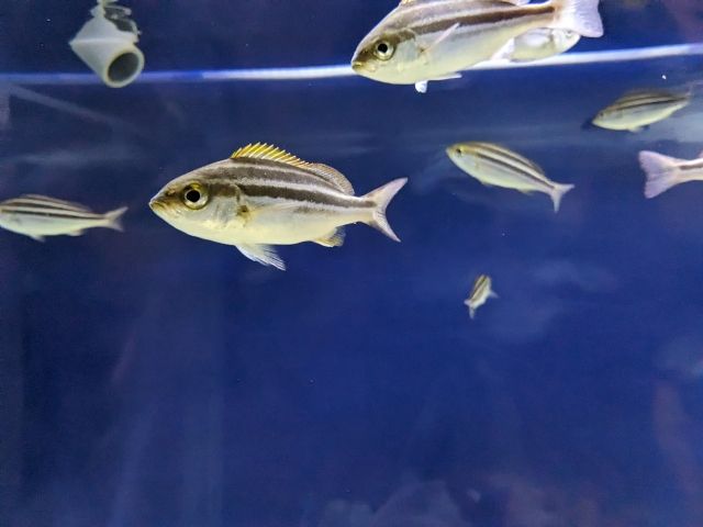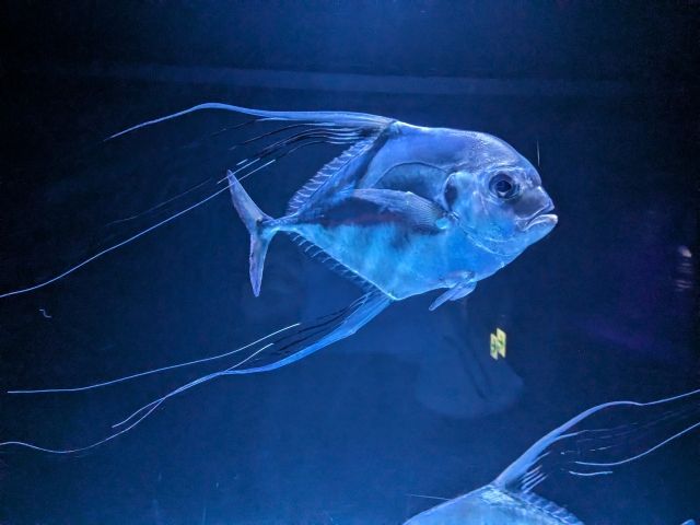 こちらもキラキラなイトヒキアジ。長く伸びる背ビレや尻ビレ、その理由は不明ですが毒を持つアンドンクラゲに擬態しているという説があるそうです。
