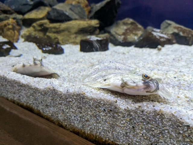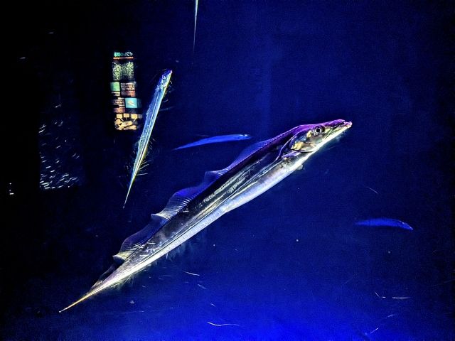 縦に泳ぐタチウオ。薄暗い中、ライトで照らされる姿は、まさに「太刀」。メタリックな刃物のように煌めきます。肉食のサカナであり、下からゆっくり獲物に近づき体をS字状にくねらせてから一気に飛びかかって捕食するそう。一度はその姿を見てみたいものです。