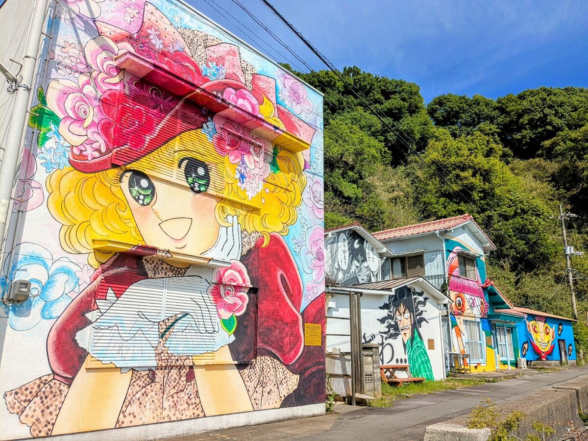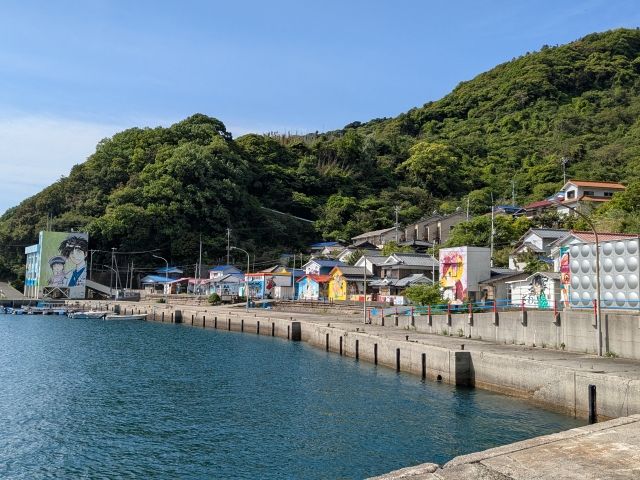 港のそばに立ち並ぶ家屋、その壁にはカラフルなアートが描かれています。静かな離島の集落であるのに、とっても華やかな印象。