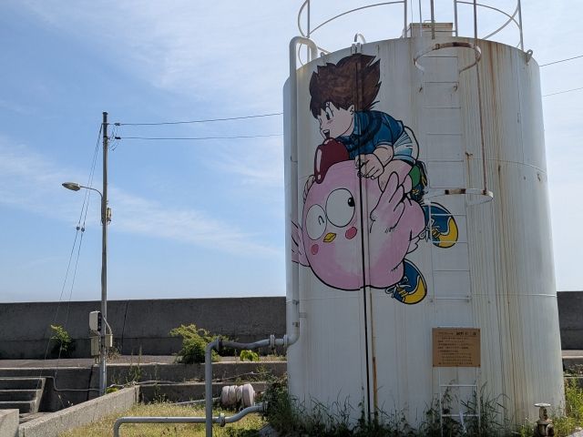 集落から少し離れたタンクに描かれているのは、細野不二彦さんの『Gu-Guガンモ』。実は先日のライブ配信でなぜかこの作品の話題になり、キャラをよく知らずに困っていたところ、島に詳しい百島さんが「高井神島にもいるよ」と教えてくれたんです。慌ててカメラフォルダを見返すと、知らないうちにその絵を撮っていたという、ちょっとした偶然のエピソードがありました。コーヒーを飲むと酔っぱらうのですよね?