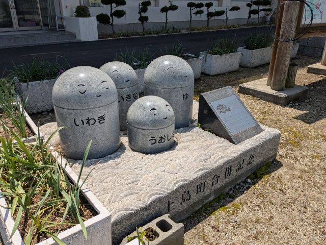 上島町合併記念碑という、4つの石碑が並んでいます。てっきり「ゆめしま海道」の4島かと思いきや、「ゆげ」「いきな」「いわぎ」「うおしま」。魚島の属する上島町は2004年に誕生した町。弓削町・生名村・岩城村・魚島村の4町村が合併したので、この石碑は島ではなく町村を表しているのでしょうね。