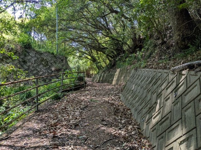 飛び交うハッチに注意しながら、垂れ下がるケムンパスを交わしながら進んでいくと、落ち葉が積もる道路に出ました。すぐ近くには「魚島村簡易水道浄水場」があります。