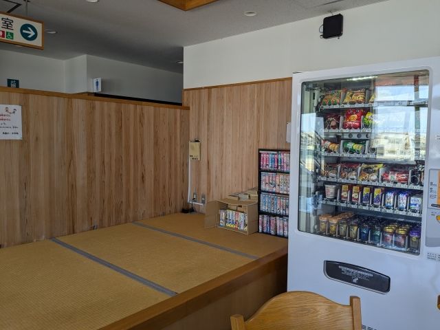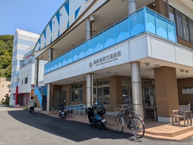 こちらの地域交流施設が屋内待合室。内部にある自動販売機には、飲み物だけでなくお菓子やパン、カップヌードル、そして「魚島の海苔」も扱ってます。