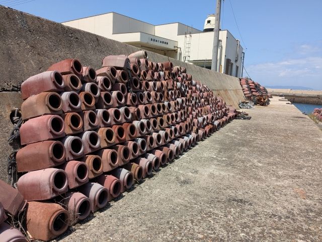 港にずらりと並ぶタコ壺。島の人にとってはなんてことない日常の風景ですが、都会から来た身としては目新しい光景。タコ壺漁だけでなく、カレイの一種であるデベラ漁も盛んとのこと。