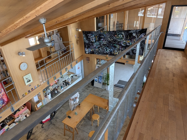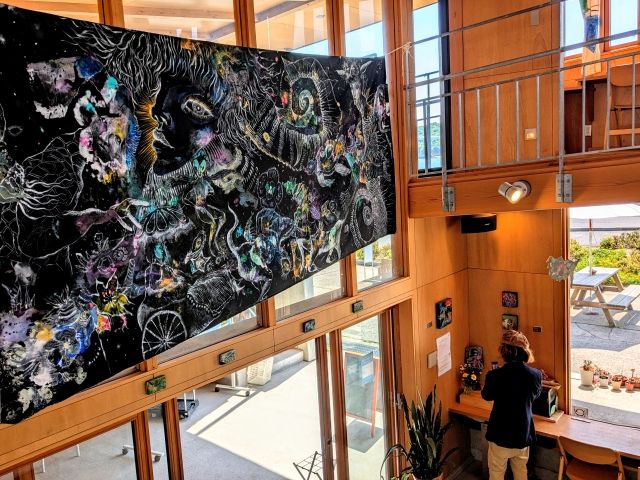 訪問時は矢野ミチルさんという因島在住の作家さんの個展開催中でした!館内には多数の作品が展示されており、ちょうど御本人もいらっしゃいました。黒地に描かれた華やかながらも幻想を感じる作品、ポストカードで持ち帰りたくなりました。