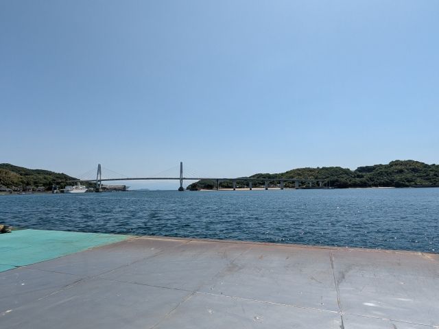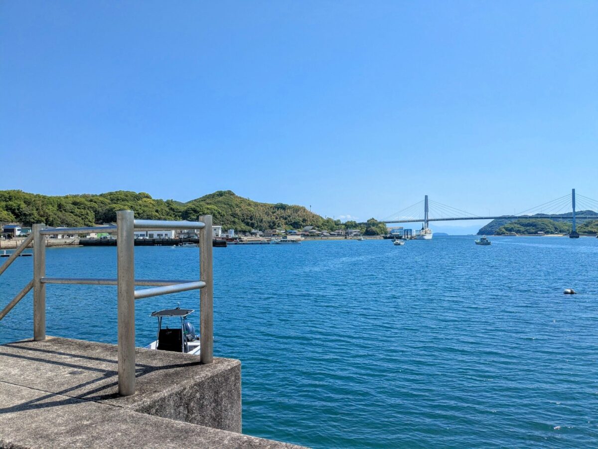 港から見えるのは島と島に架かる弓削大橋。弓削島は、生名島・佐島・岩城島と橋で繋がっており、「ゆめしま海道」と呼ばれています。