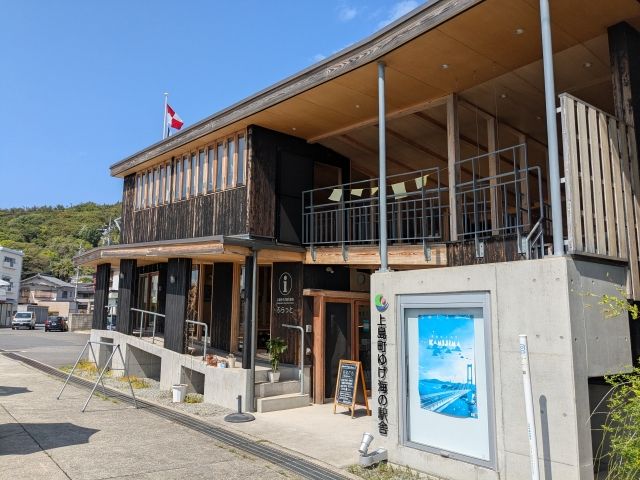 港から少し歩くと、情緒とモダンが混在したような不思議な建物が。こちらはゆげ海の駅舎ふらっと。ヨットマンやサイクリストがふらっと立ち寄れる憩いの場です。