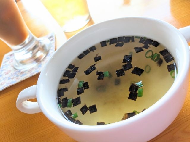 まずはスープから!浮いている黒いものは弓削海苔。弓削島は海苔の産地でもあるのです。