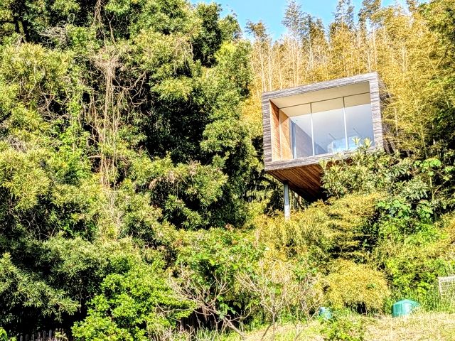 豊島ゲストハウスから山の方を見上げると、木々に包まれた謎の建築物が。