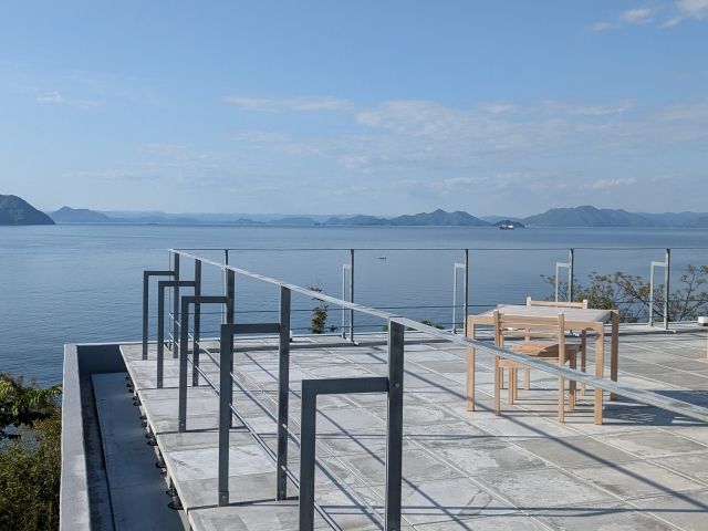 洗練されたデザインのオープンテラスが素敵で。腰掛けてみたいところですが、フェンスで囲われているので断念。