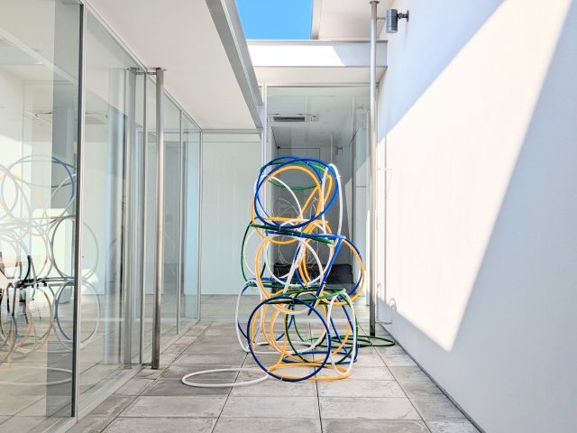 建物の側面に進んでみると、中庭に展示されたアートを発見しました。フラフープのようなカラフルな輪っかが積み重なった作品です。