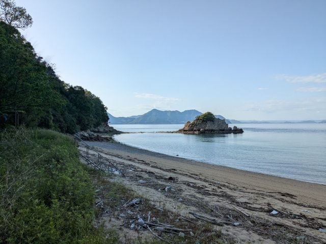 しばらく歩くと海辺に出ました!マップによると、ここは平吹の浜海水浴場。砂州で繋がりそうな小島もあります。